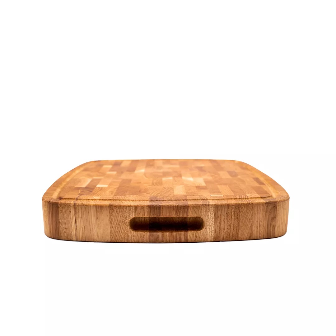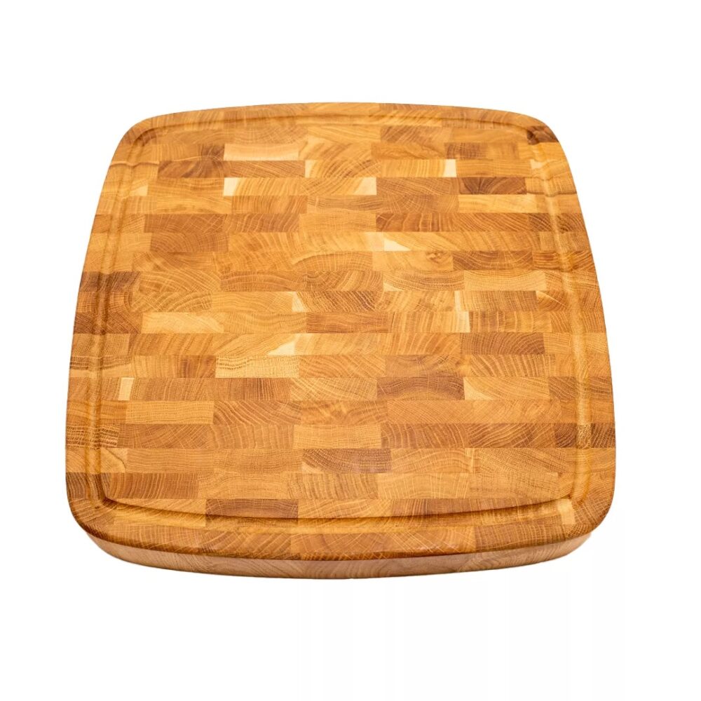 מרובע עם פינות מעוגלות, תעלות לניקוז נוזלים ומגרעות נשיאה. butcher endgrain.