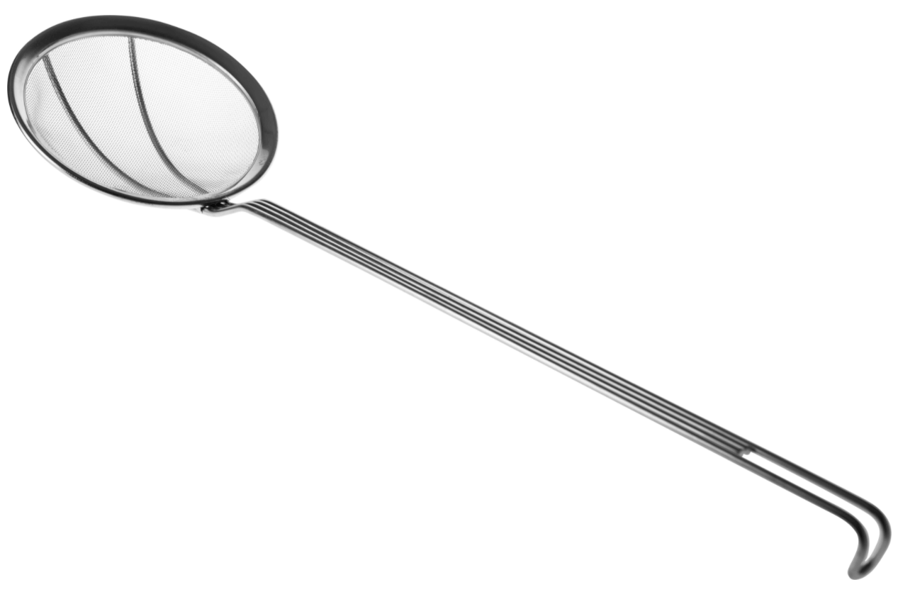 כף מסננת רשת עגולה, בעלת ידית אחיזה ארוכה.