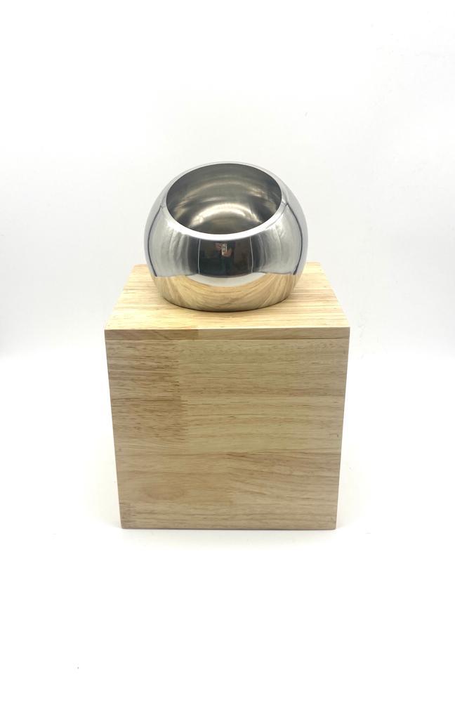 מעמד עץ מעוצב ועליו כדור נירוסטה מלוטש בחיתוך לייזר במידה 20 ס"מ , מתאים להגשת רטבים/ממרחים/תה/קפה/סוכרים/תוספות ועוד…