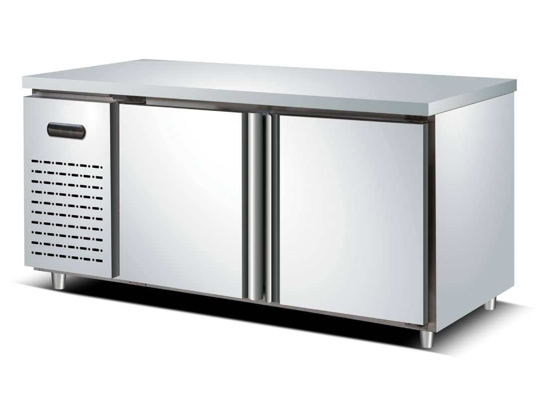 מקרר דלפק בעל 2 דלתות העשוי נירוסטה, בעל משטח עבודה.