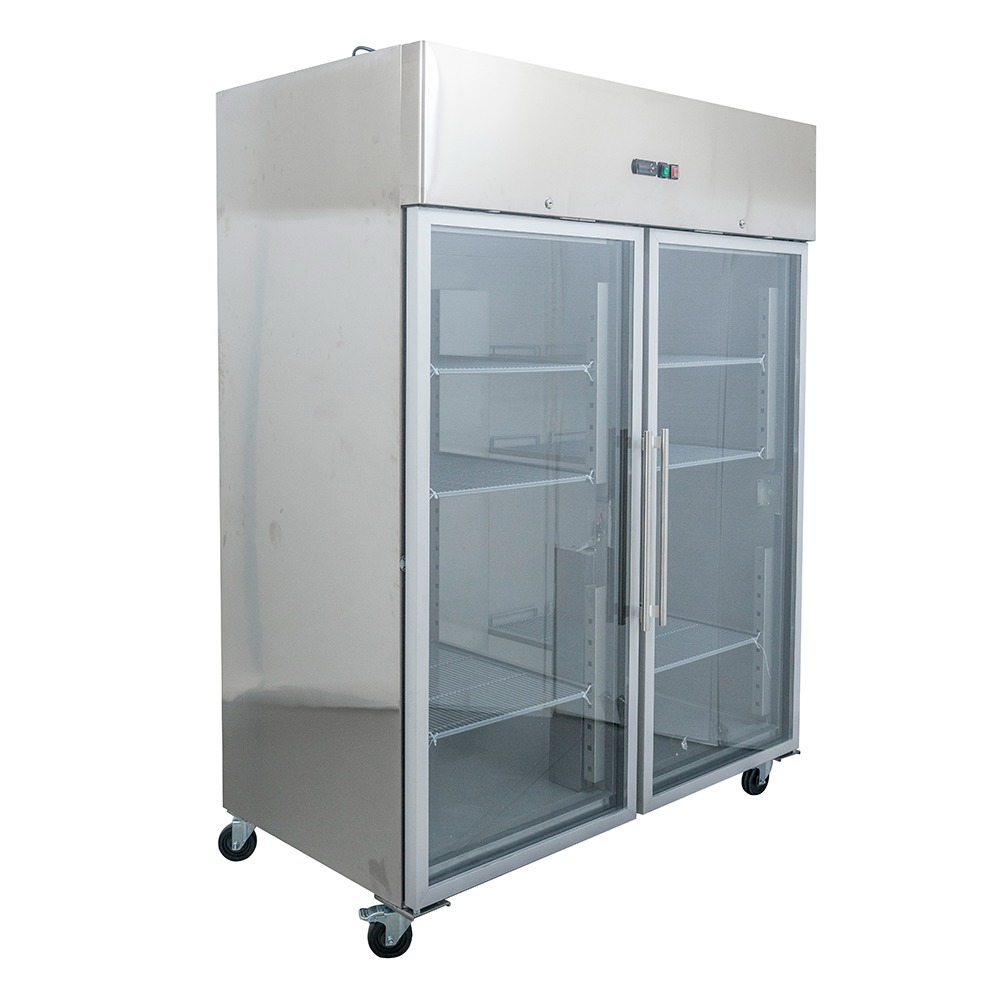 מקרר תעשייתי נירוסטה עומד – 2 דלתות זכוכית | קיבולת: 1300 ליטר | דגם GN1410TNG | מידות: 148×83×201 ס"מ | טווח טמפרטורה: 2-8 מעלות |