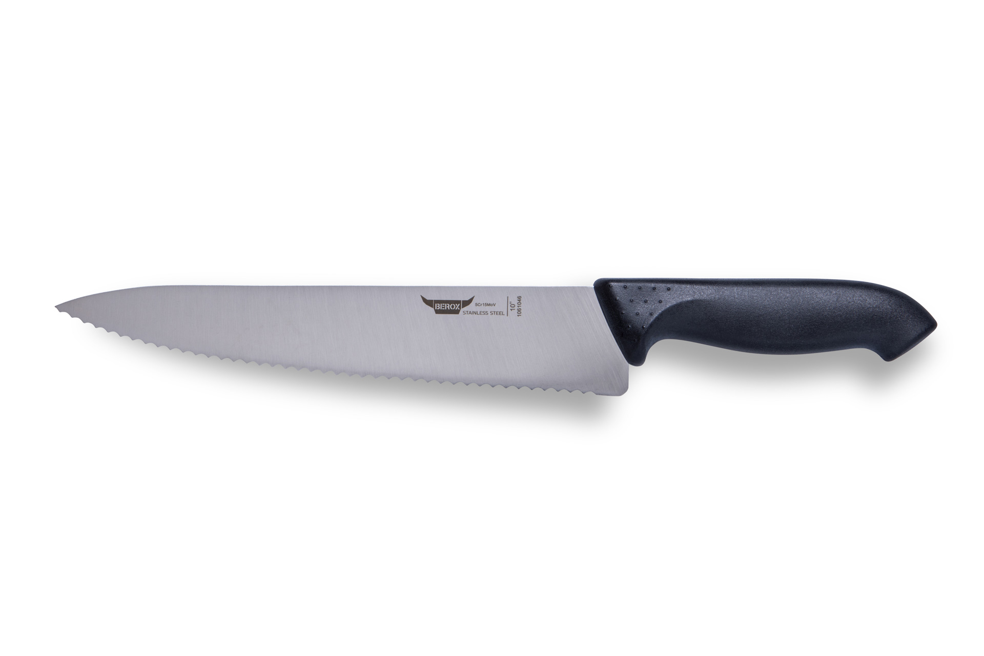 סכין שף קלאסית משוננת עם ידית פלסטיק באורך 25 ס"מ של BEROX. סכין לשימוש רב תכליתי במטבח. מתאימה לחיתוך ירקות, עשבי תיבול, בשר דגים, עופות ומגוון חומרי גלם נוספים. בעלת להב חד במיוחד לשמירה על עמידות וחדות לאורך זמן.