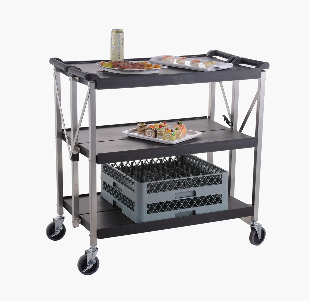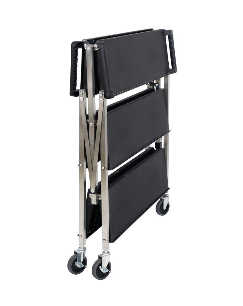 עגלה מתקפלת עשויה פלסטיק , 3 מדפים, מידה : 930x510x930 מ"מ, מתאימה למזנונים, חוסכת מקום איחסון, קיפול מהיר, גלגלים + מעצור