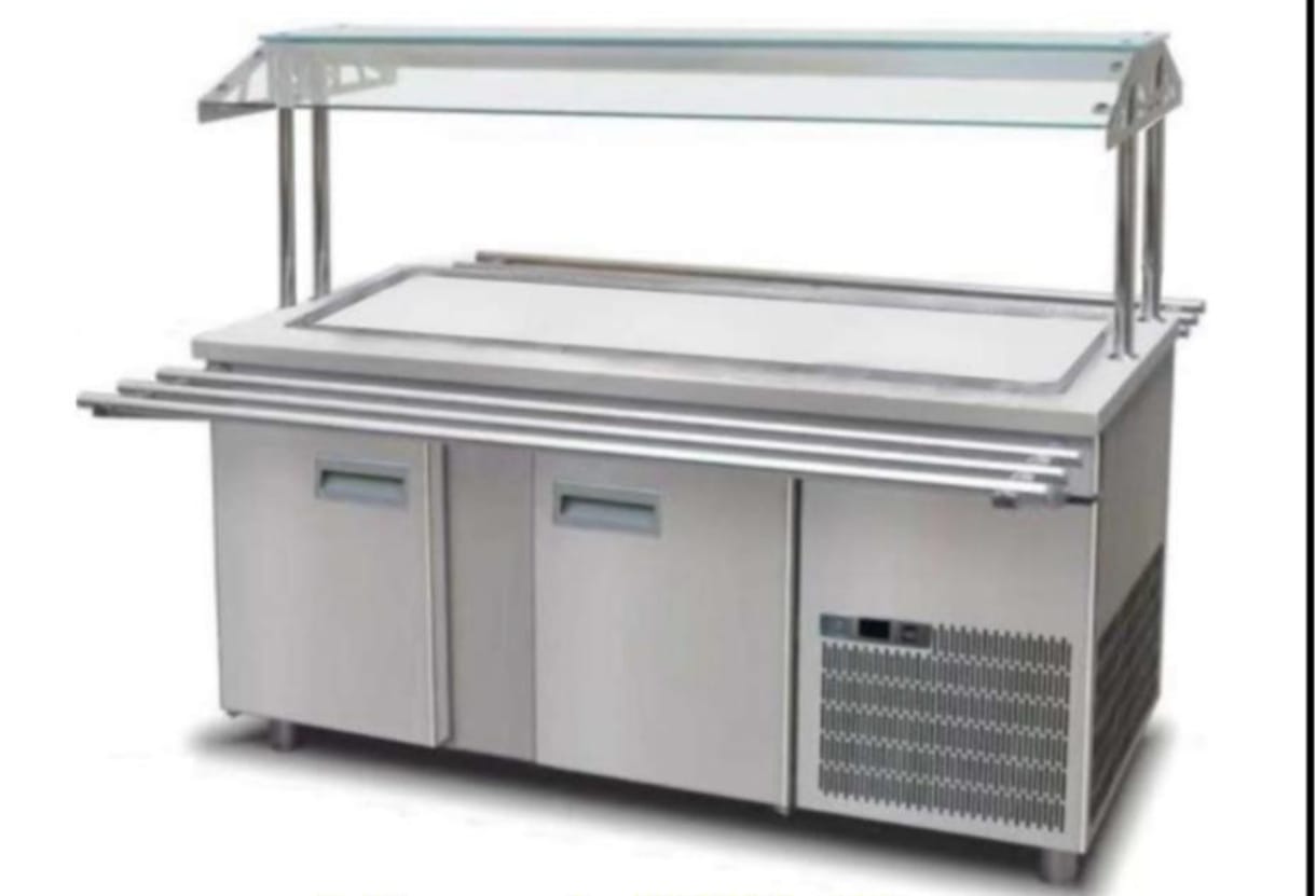 עגלת קירור בעלת משטח קירור שטוח העגלה בעלת מקרר דלפק תחתון בעל 2 דלתות עבור 5 גסט' 1/1 מידות: 180/900/136 נפח: 300 ליטר, העגלה מיועדת להגשת סלטים, קינוחים ועוד.