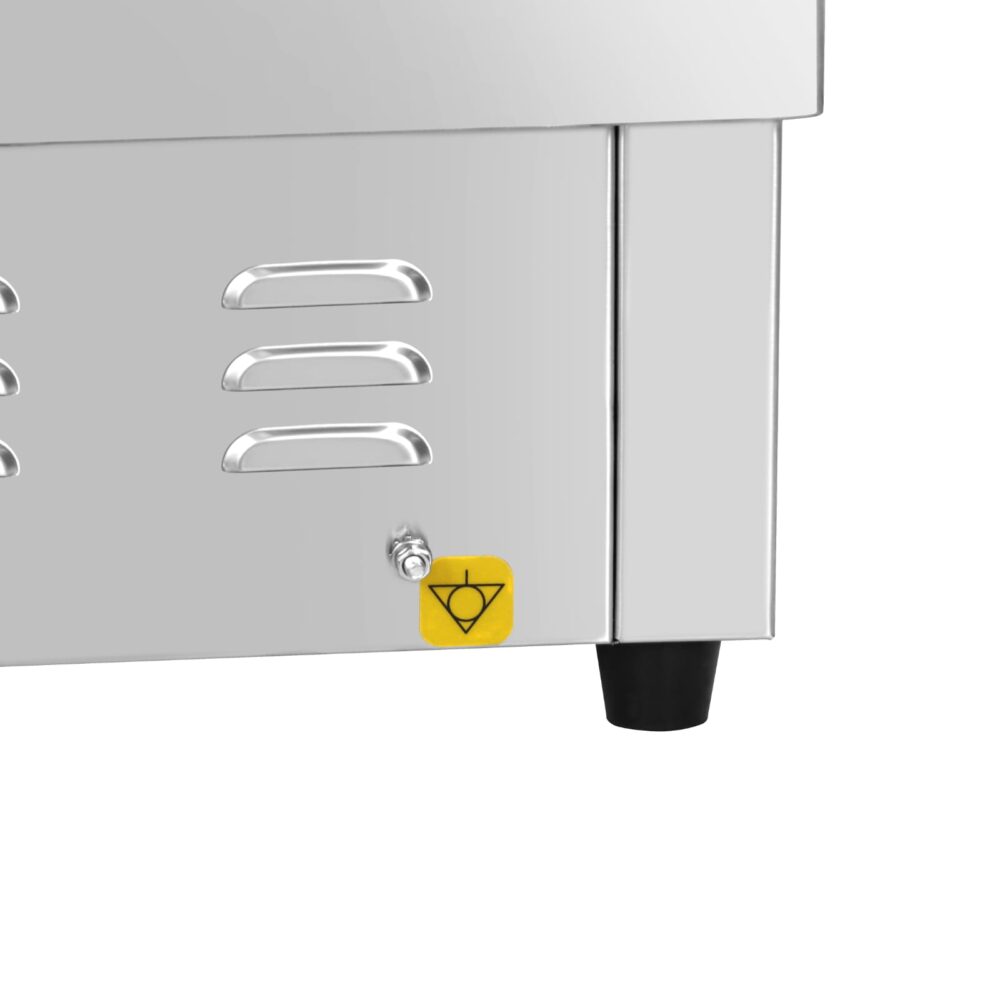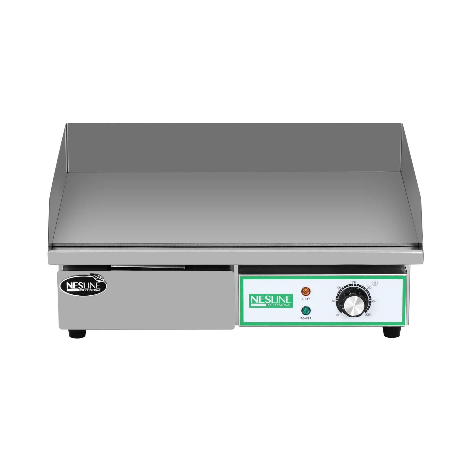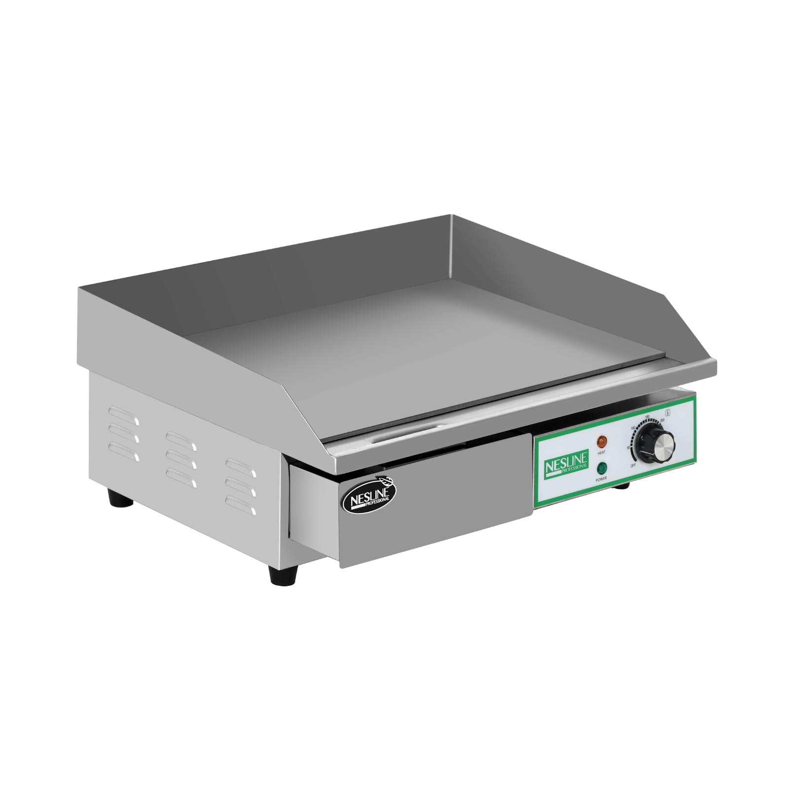 פלטת צלייה חלקה לשימוש תעשייתי 55/40 ס”מ מבית NESLINE חזקה במיוחד, לשימוש מקצועי. בית נירוסטה אמיד, משטח ברזל. מגש נוזלים נשלף. חיבור חד פאזי.