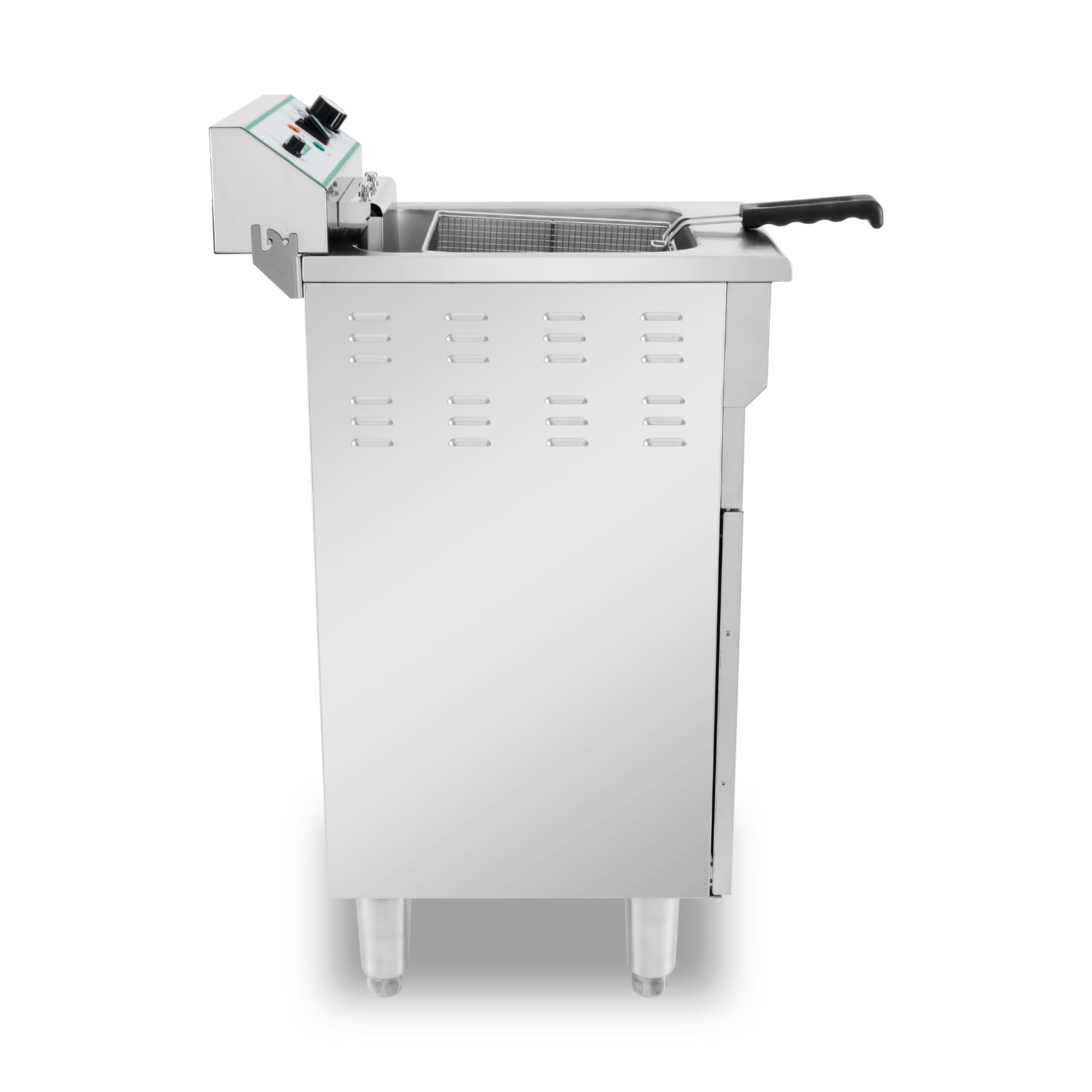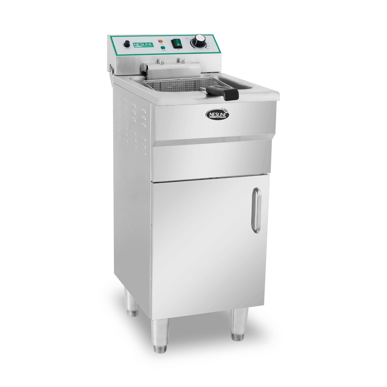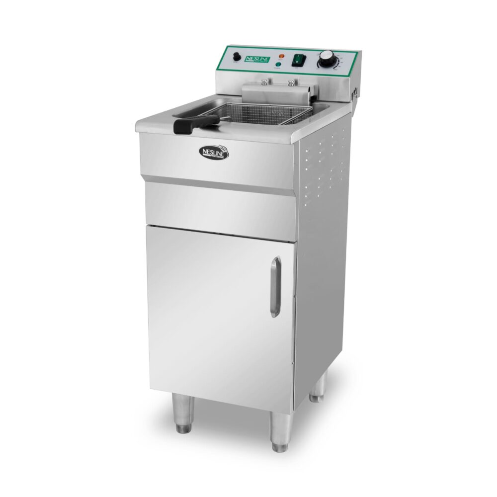 צ’יפסר חשמלי ריצפתי תעשייתי עשוי נירוסטה בנפח של 16 ליטר, בעל סלסלת נירוסטה, תא איחסון תחתון, הספק: 5KW, משקל: 19.5 ק"ג