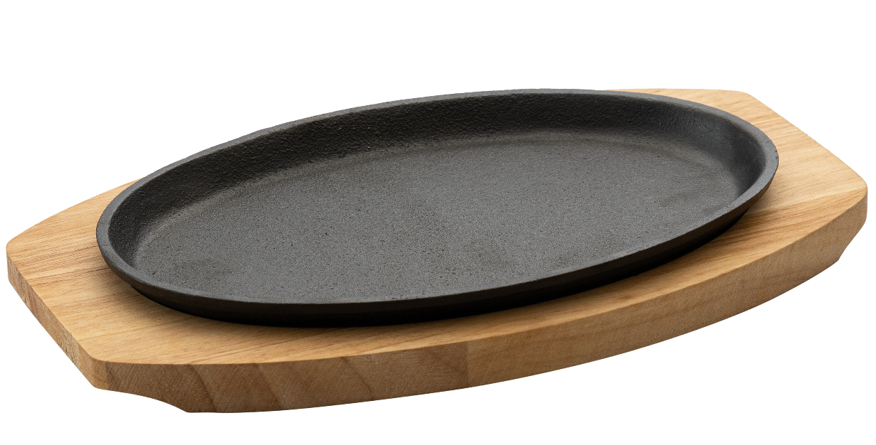 צלחת אובלית יציקת ברזל עם תחתית עץ 27X18 ס"מ