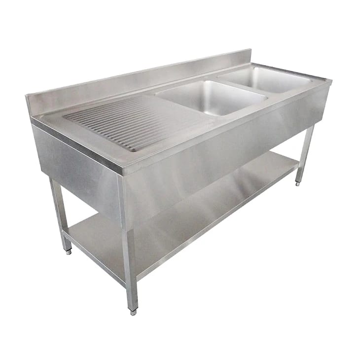 שולחן עבודה נירוסטה בעל 2 כיורים ומדף תחתון, כולל הגבהה מאחור עם מדף ורגליים מתכווננות.